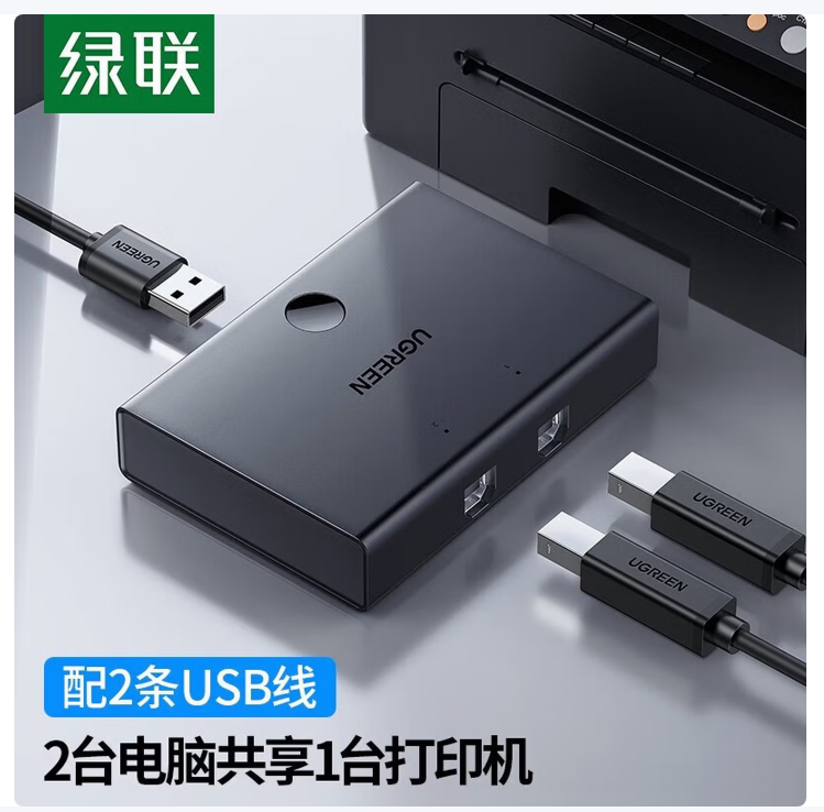 绿联/UGREEN US1289 网络连接设备 USB打印机共享器分线器一分二 四进一出切换器 笔记本电脑接鼠标键盘U盘4口转换器一拖四 二进一出【打印机共享器】