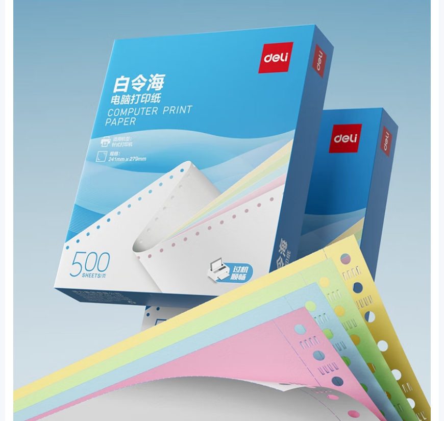 得力/deli DLBLH30241 复写纸 复写纸白令海 三联无等分撕边电脑打印纸 彩色针式打印纸(241-5-1/3CS色序:白红蓝绿黄1000页/箱)
