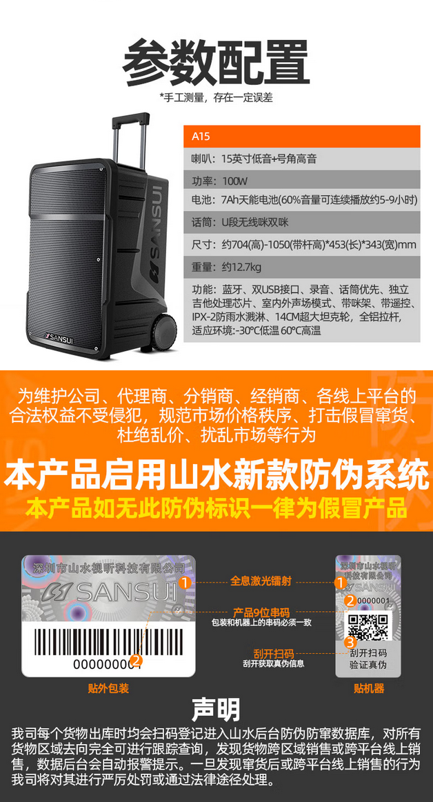 山水/sansui A15 音箱 15英寸广场舞音响 便携式移动户外蓝牙拉杆音箱重低音 多媒体会议扩音器带无线麦克风