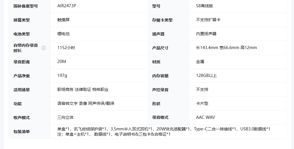 科大讯飞/iFLYTEK S8 录音笔 AI录音笔S8离线版【新品】 256G大内存 20米远距离录音 安全加密 高清降噪 离线转写翻译