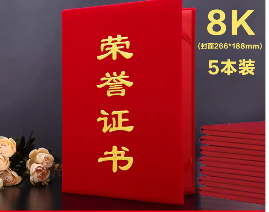 中麒 ZQ8K 薄本册 荣誉证书精致绒面烫金获奖证书颁奖证书奖状证书外壳 8K绒面竖版字