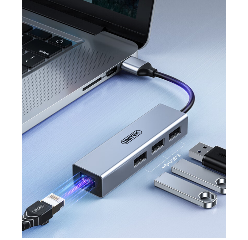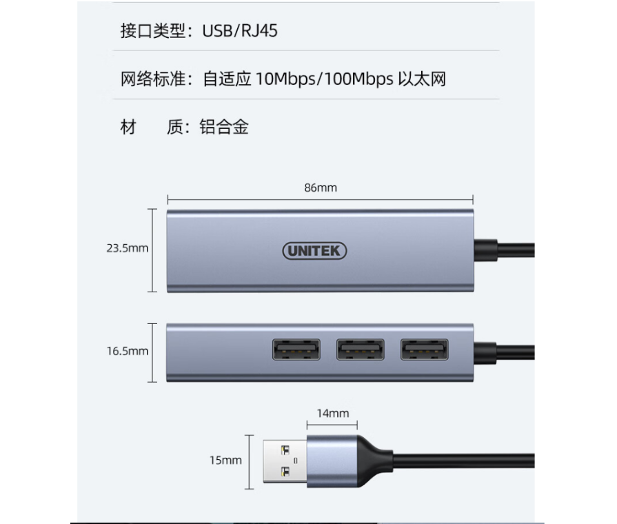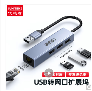 优越者/UNITEK H205A 集线器 USB转网口网线转接头 usb分线器扩展坞3口HUB集线器通用苹果华为小米笔记本百兆网卡拓展坞转换器H205A