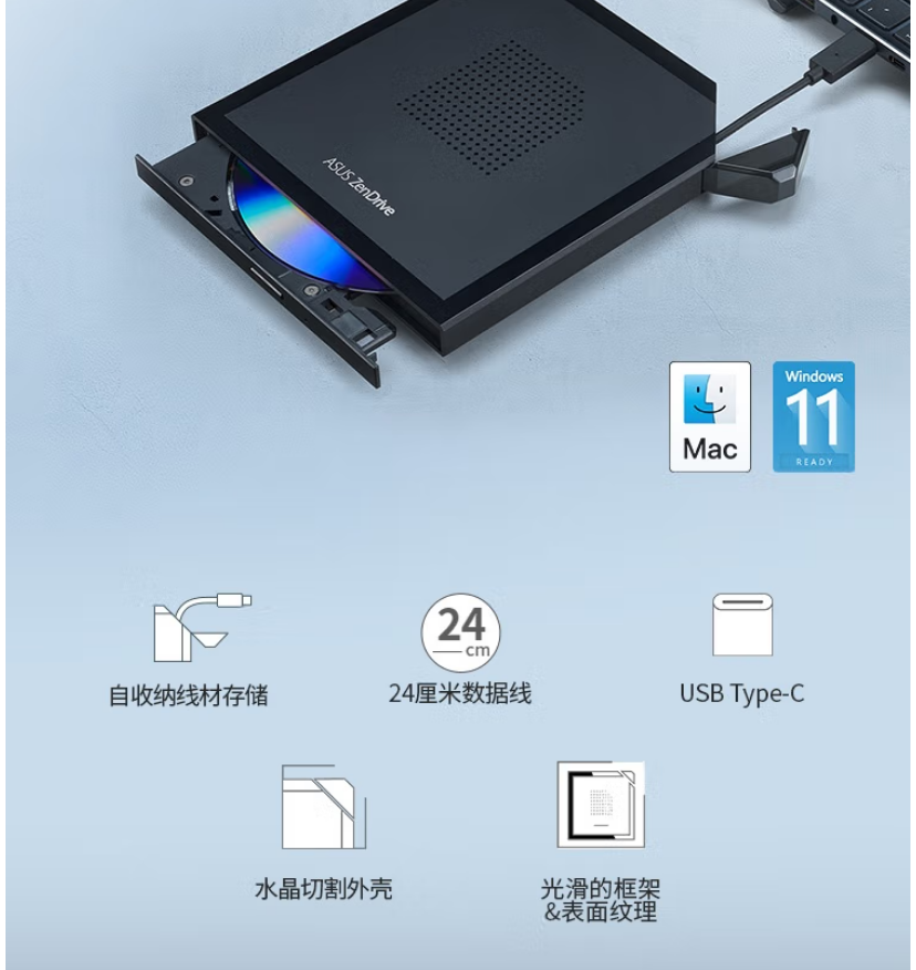华硕/ASUS SDRW-08V1MType-C 光驱 8倍速 外置光驱 DVD刻录机 Type-C接口 线材自收纳