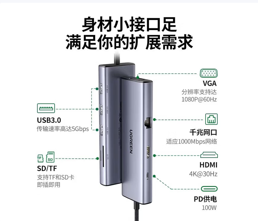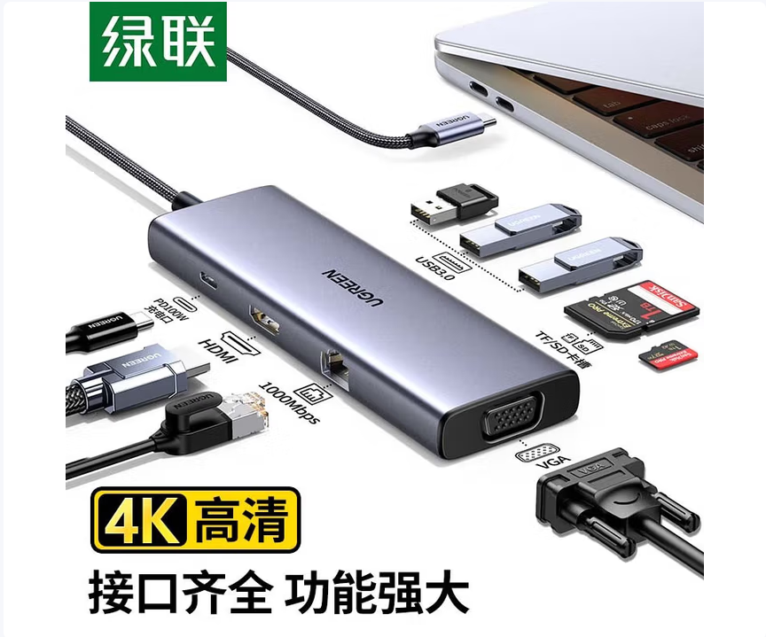 绿联/UGREEN LL15600 集线器 Type-C扩展坞USB-C转有线网卡转换器HDMI雷电4/5拓展坞HUB分线器适用Macbook笔记本电脑iPad平板 9合1【HDMI+VGA+网卡+读卡器】