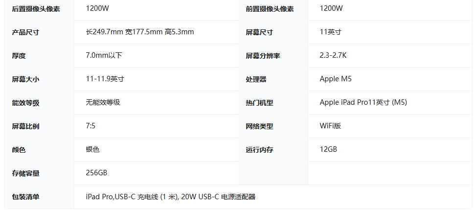 苹果/APPLE PGA3357 平板式微型计算机 iPad Pro11英寸 M5芯片 2025年新款平板电脑 256G WLAN版 银色
