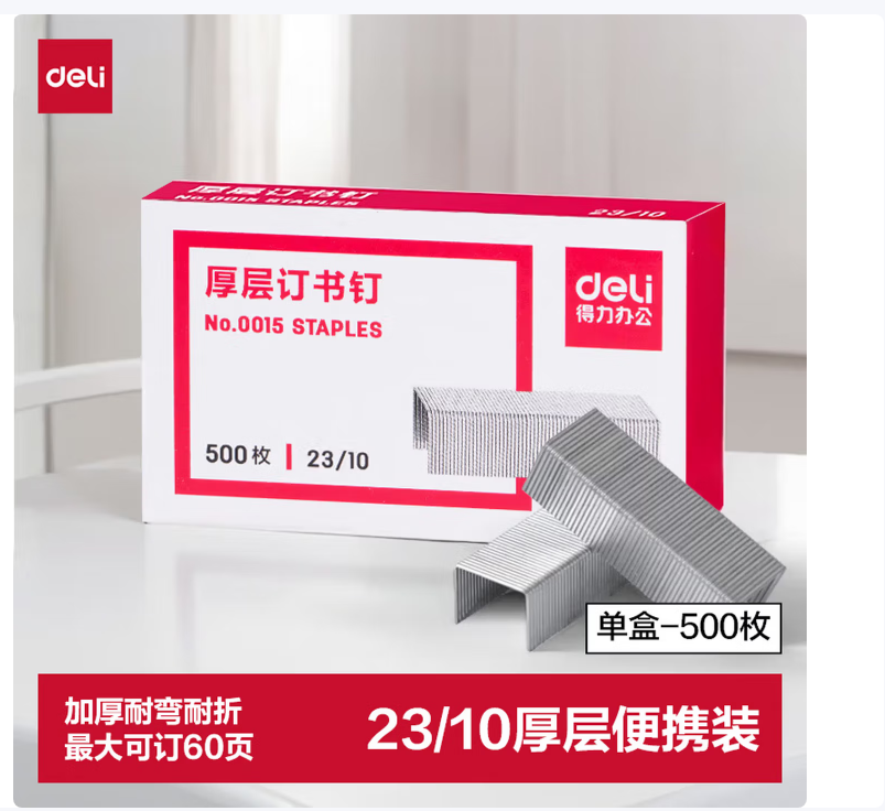 得力/deli DL0015 装订及打孔类 23/10厚层订书钉 易穿透订书针 500枚/盒 单盒装 可订60页 办公用品 0015