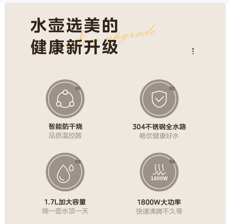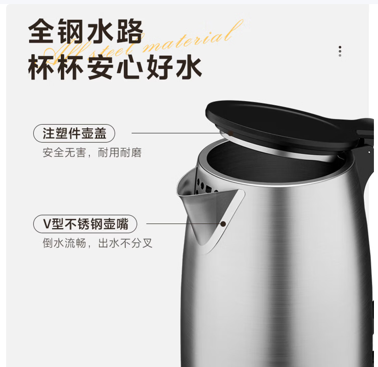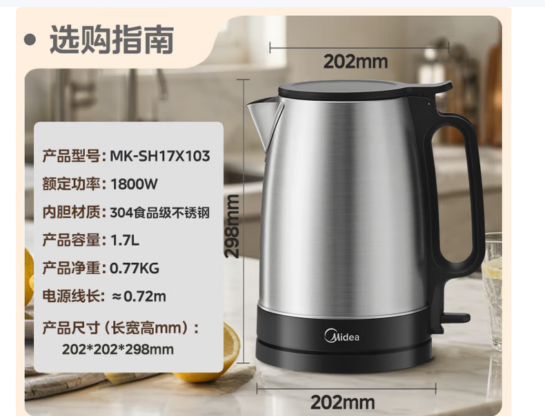 美的/Midea MD1700 壶 烧水壶电水壶热水壶母婴级不锈钢 0涂层2升大容量开水壶 双层防烫 1.7L 双钢防烫|1800W大功率