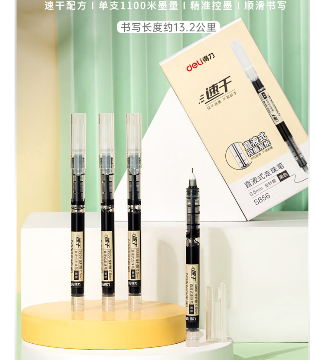 得力/deli S856 书写用笔类用具 直液笔速干笔签字笔 0.5mm全针管中性笔 商务办公学生水笔走珠笔 黑色 12支/盒S856