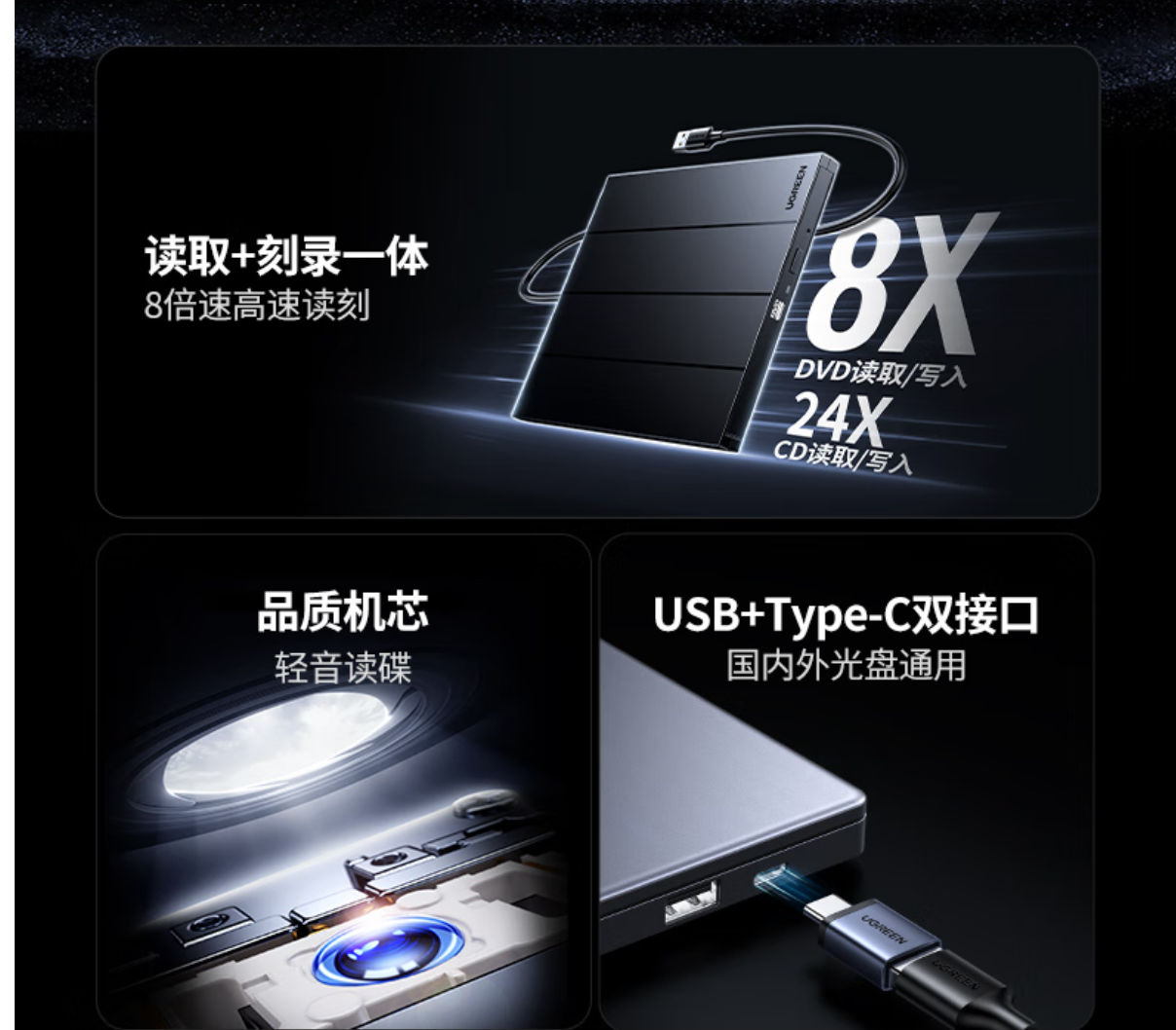 绿联/UGREEN LLCM2463 8倍速外置移动光驱 DVD光盘刻录机USB Type-C双接口 适用笔记本电脑台式机外接光驱 【USB+Type-C双口】免驱即插即用
