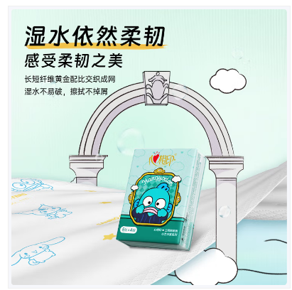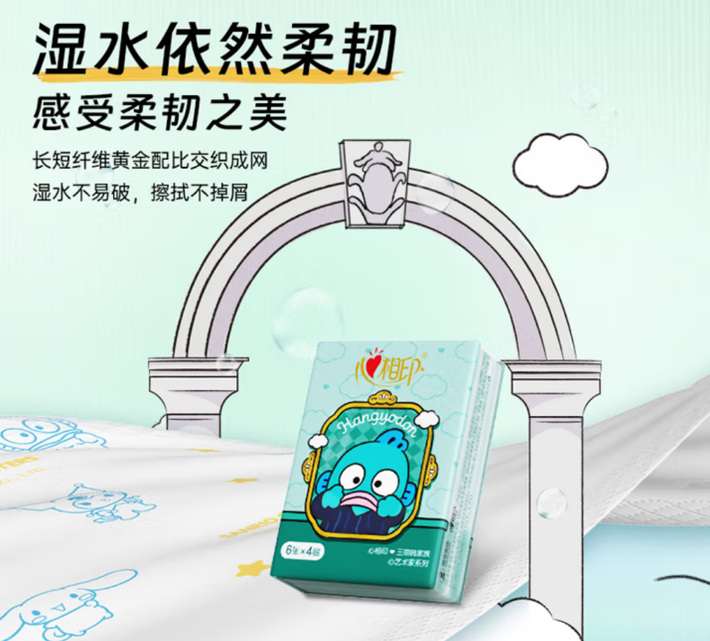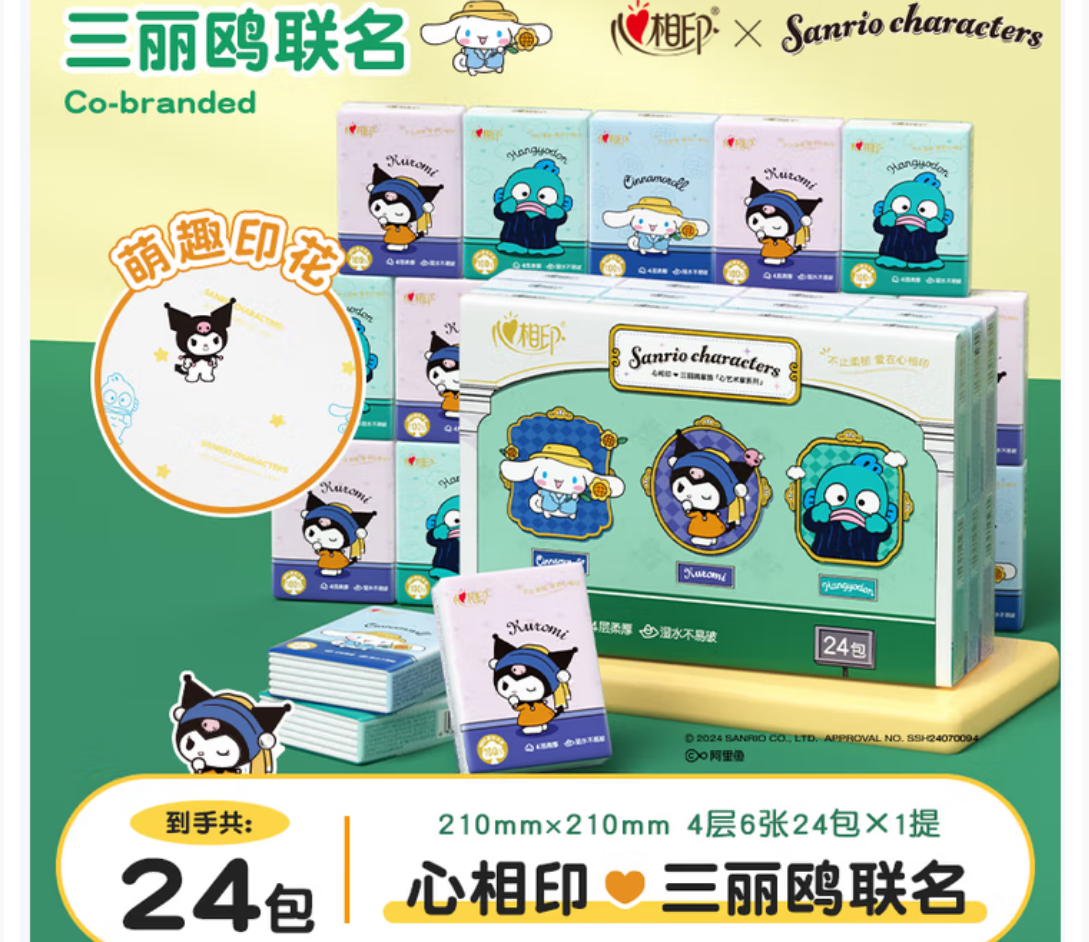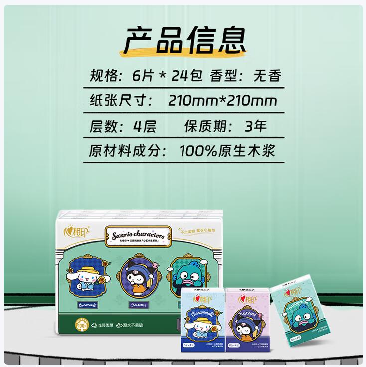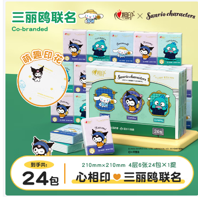 心相印/MindActUponMind XXYPC630 湿巾/手帕纸 手帕纸餐巾纸三丽鸥联名面巾纸卫生纸迷你小包出游便携纸巾 4层 6片*24包