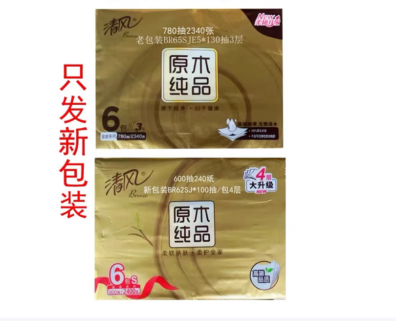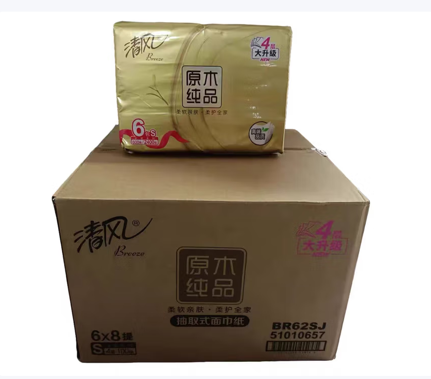 清风 BR62ST 软包抽取式面纸 原木金装抽纸四层 100抽6包/提面巾纸餐巾纸 1层 1g*1包 190mm*132mm