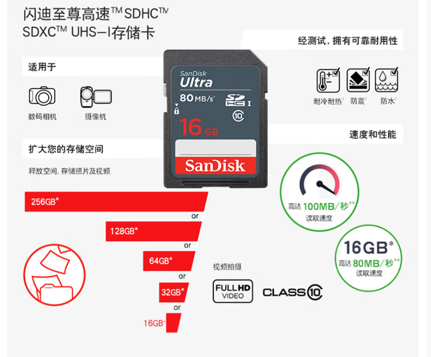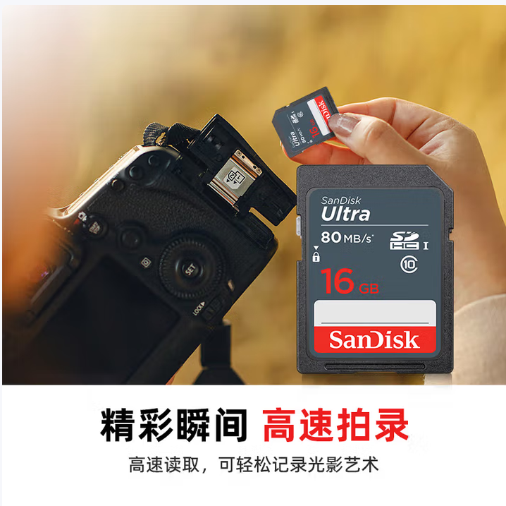 闪迪/SanDisk SDSDUNB-016G U盘/存储卡 16GB SD相机内存卡 C10 拍摄全高清视频 微单/单反数码相机存储卡 坚固耐用 超高性价比
